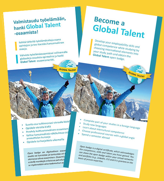 You want to encourage students to develop global competence during their university studies. Global Talent Open Badge is a reward for completing specific studies and having completed a study or work placement abroad. Global Talent Open Badge is also a quality assurance, since it is issued on behalf of the student’s home university. If your university values communication skills in many languages, intercultural competence and you encourage students to study or work abroad, then we encourage you to also start using Global Talent Open Badge.